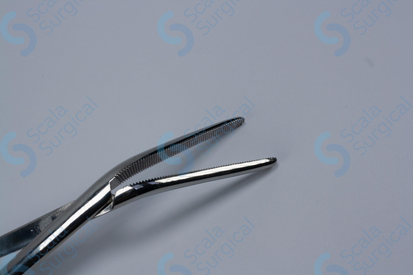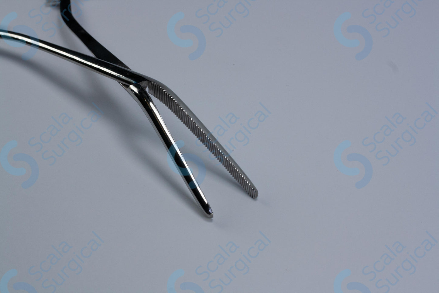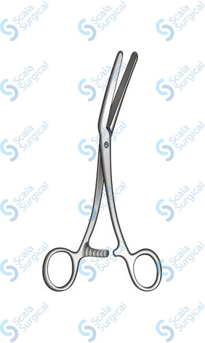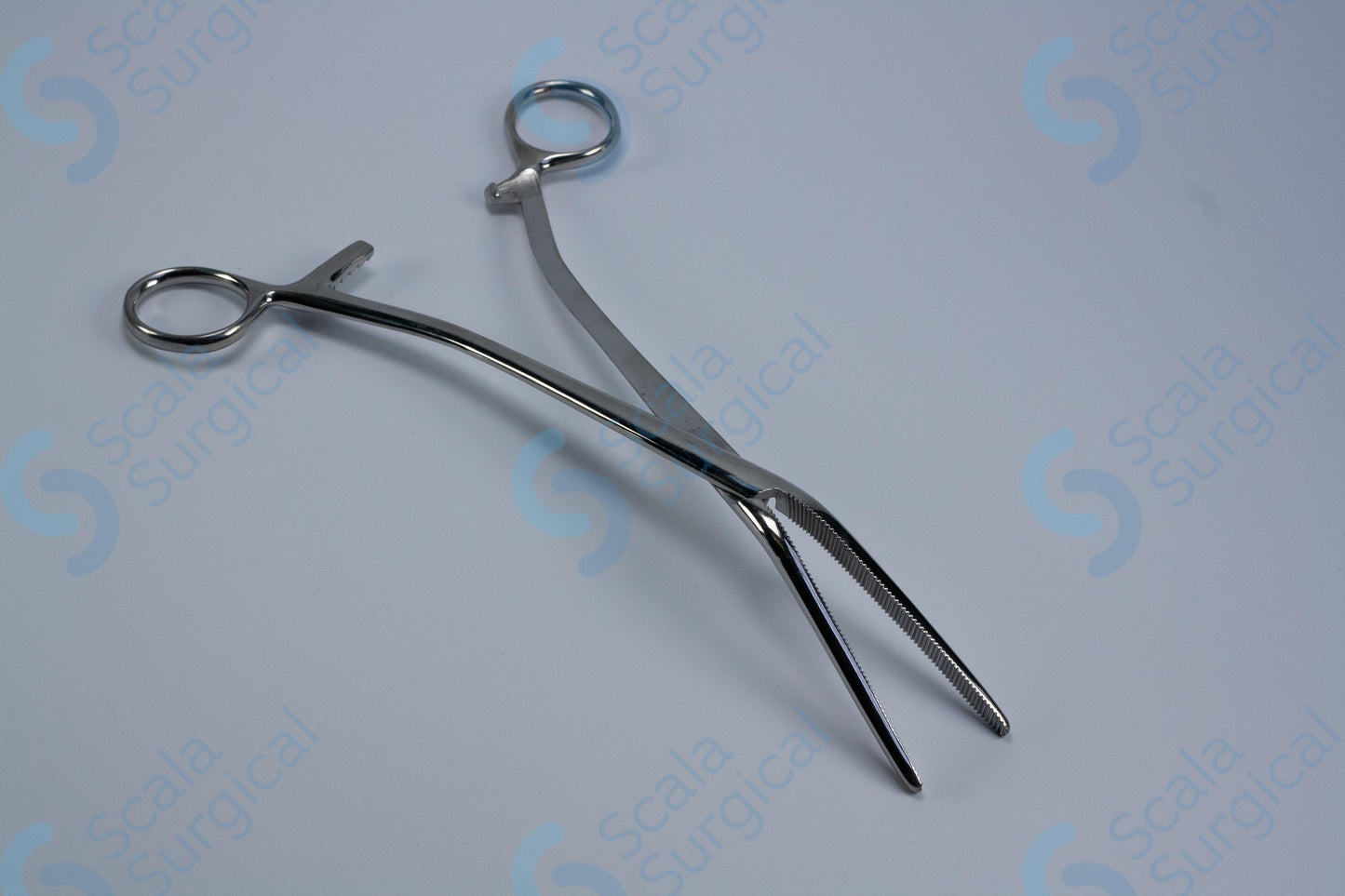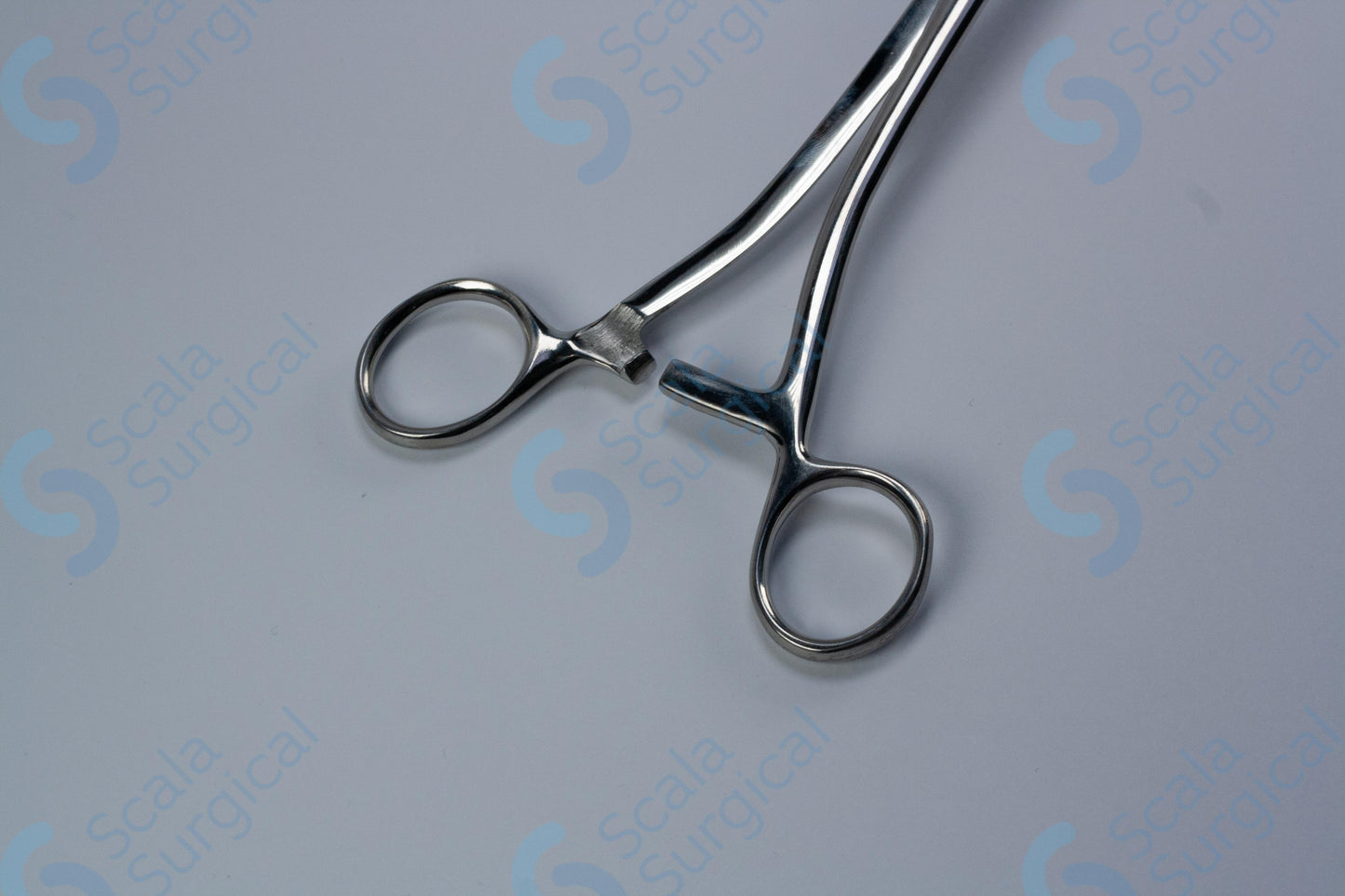 This device is used to clamp the pedicle of a kidney during a kidney transplant surgery. It is angled on a flat screw joint and is 215mm (8? inches) in length. The clamp is used to secure the kidney in place during the transplant procedure.