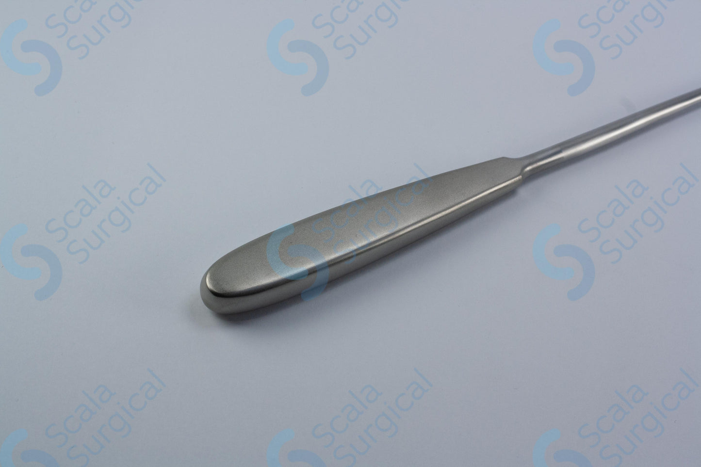 A Sims Uterine Curette is a surgical instrument used to scrape and remove tissue from the walls of the uterus. It is commonly used in gynecological procedures such as dilation and curettage (D&C) and endometrial biopsy. The sharp, single-ended rigid shaft allows the doctor to reach deep into the uterus and scrape away any abnormal tissue. The width of the curette (4mm) and the length (255mm or 10 inches) are important factors in determining the reach and effectiveness of the instrument.